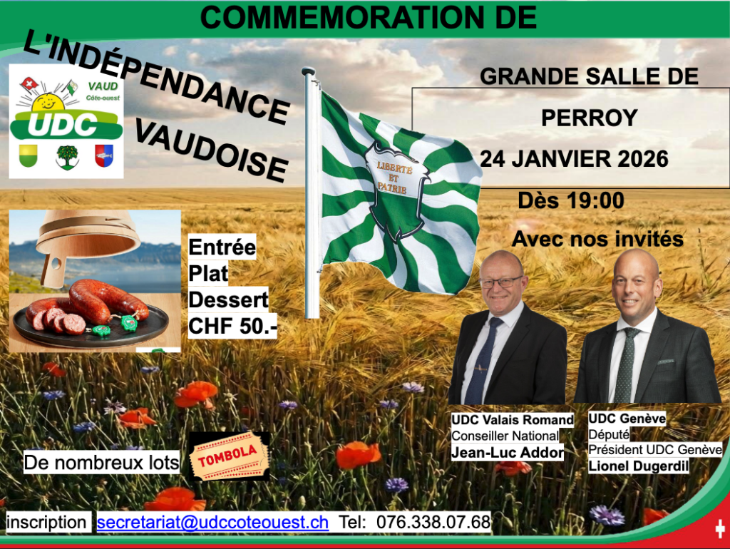 Chers amis réservez cette date le: 24 Janvier 2026 pour fêter l’indépendance Vaudoise avec orateurs , tombola et succulent repas, le reste des informations suivront.